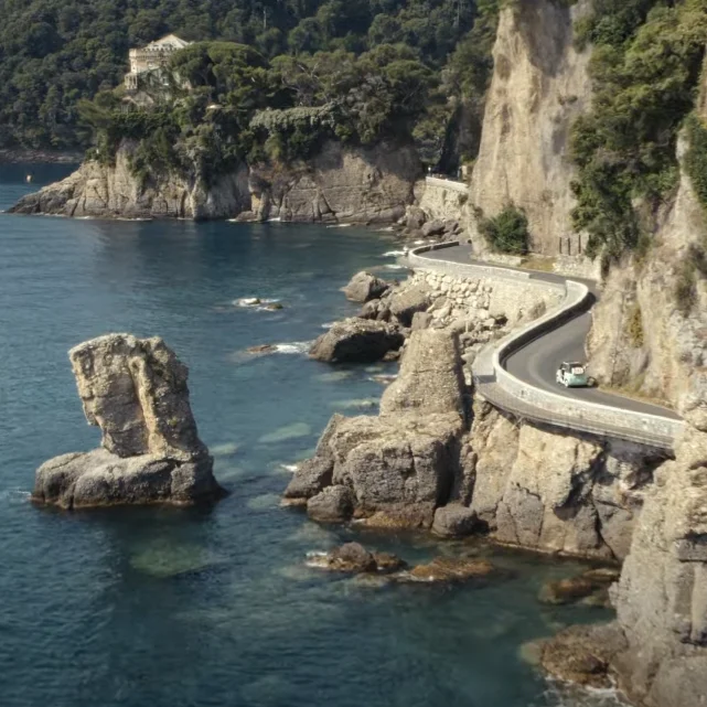 Il video si apre con un’inquadratura panoramica di una Fiat Topolino che sfreccia lungo una strada costiera soleggiata a Portofino, meta esclusiva in Liguria. La telecamera si concentra poi sull’auto, mostrando i suoi dettagli esterni e interni. Le immagini sono luminose e vivaci, trasmettono un senso di gioia e spensieratezza.